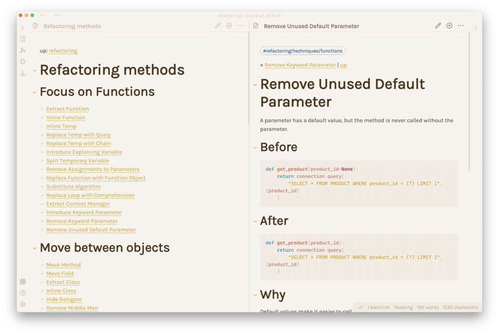 Besides having python-specific methods, this toolkit translates the "traditional" refactoring practices into modern python—and gives you a get-out-of-jail-free technique that is easy to remember and can help you if you don't have the refactoring methods handy.